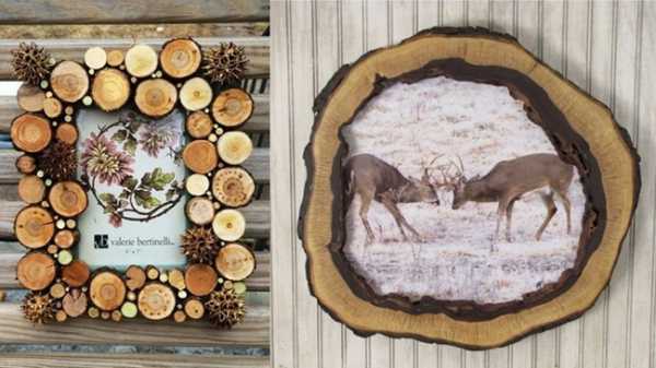 2. Рама для картины или фото делается простым способом. Наклейте небольшие срезы веток на основу и декор для дома готов! А если картину приклеить прямо на спил дерева, то получится еще лучше.