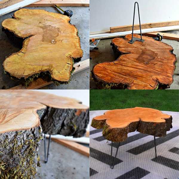 4. Стол своими руками из дерева можно сделать глядя на инструкцию снизу. Главное найти большой спил дерева необычной формы. Прикрепить к нему готовые ножик и ваш дачный стол из дерева готов! У этого деревянного спила действительно крутая форма!