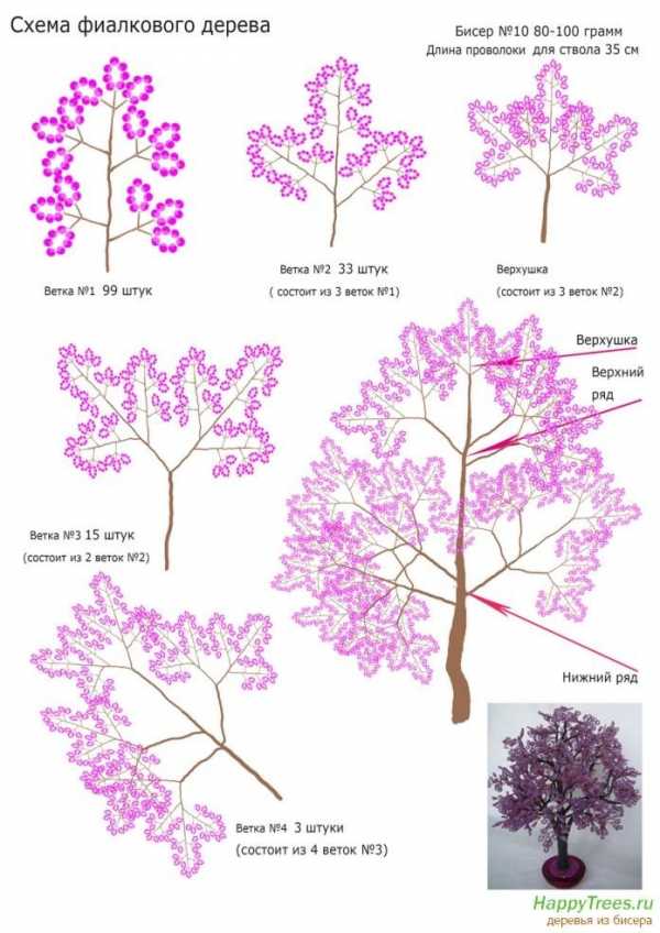 Бисерный бонсай делается относительно просто, техника не сложная. Тут главное – терпение. Его понадобится больше всего остального. Потому что все элементы одинаковые, а их надо очень много. Вот схема для любого дерева из бисера: