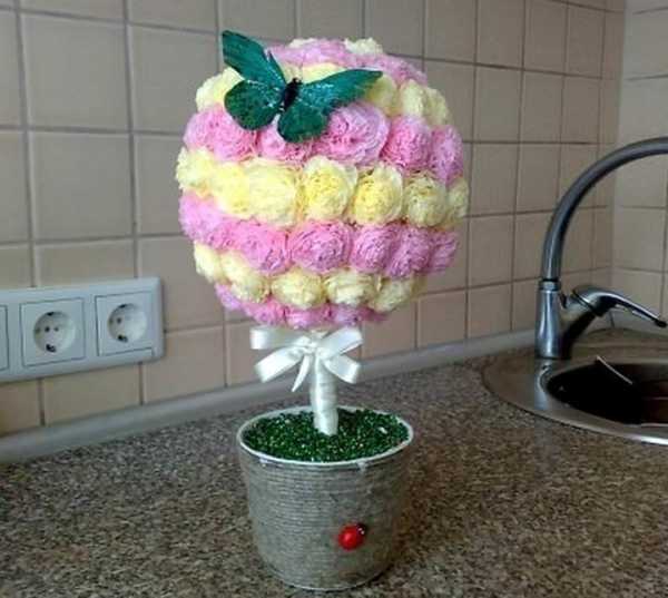 - Шикарный вид имеет топиарий своими руками, изготовленный из ста бумажных розочек. Даже его фото производит потрясающее впечатление, а сделать его совсем несложно. Схема изготовления предельно проста. Для этого потребуются основа из пенополистирола, декоративный вазон и бумажные розы. Сделать их легко – длинные ленточки бумаги скручиваются при помощи карандаша. Для усиления эффекта уложите в горшке с розовым деревцом изумрудно-зеленый мох. Чтобы делать топиарии своими руками, для кроны можно использовать подручные материалы – клубки, мячи и даже бумагу, смятую в ком.