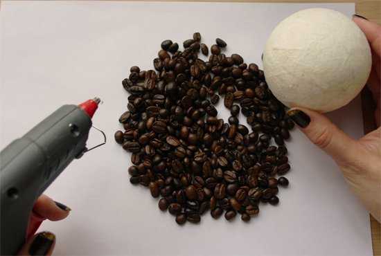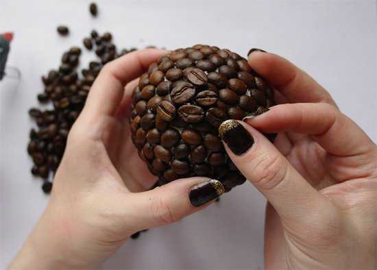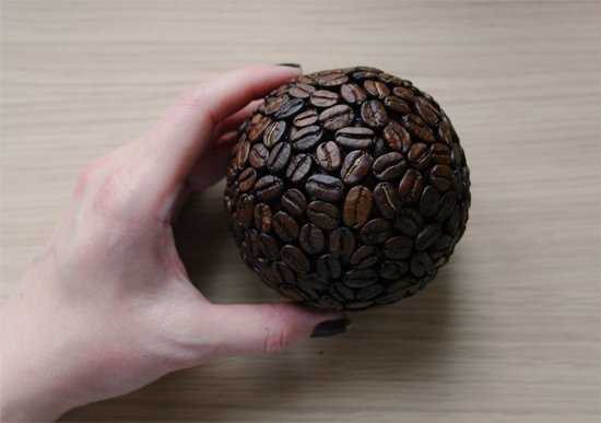 - Обклейте плотно зернышками кофе всю поверхность шара, зерна располагайте полосочкой вниз.