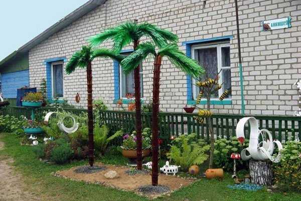 Дерево больших размеров – довольно трудоемкая и долгая работа. И понадобится много материала. Поэтому лучше всего взять то, что само просится – пластиковые бутылки! И экология будет спасена, и ваш садовый участок будет оригинально украшен. Посмотрите на эти замечательные пальмы: