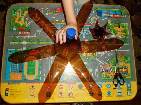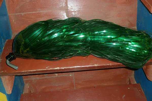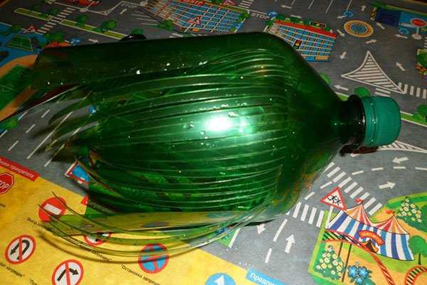 - Вам нужно много зеленых пластиковых бутылок. Их надо разрезать пополам – каждую половину режем на бахрому.