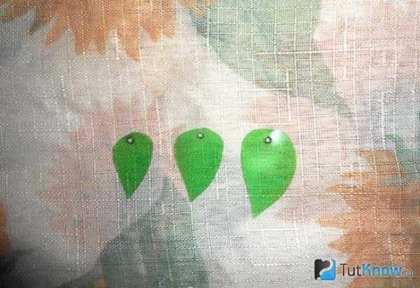 - Из пластмассовой бутылки зеленого цвета вырезайте листики. В каждом проделайте дырочку паяльником или выжигательным прибором.