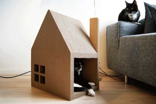 Интересно смотрятся домики из гофрированного картона для кошек, поверхность которых очень приятно царапатьКошачий домик своими руками из фанеры