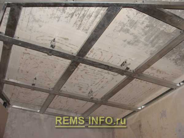 Вся конструкция фиксируется к потолку прямыми подвесами. Перпендикулярно установленным потолочным профилям с помощью крабов устанавливаем отрезки из того же ПП профиля – получаем каркас будущего потолка.