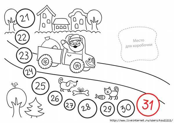 Вот и все, простой адвент-календарь для детей, сделанный своими руками из бумаги готов. Легко и быстро 🙂 И самое главное — в его изготовлении принимал участие ребенок). Ниже я покажу фото адвент-календаря (более качественные шаблоны можно бесплатно скачать по ссылке выше).
