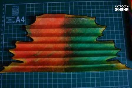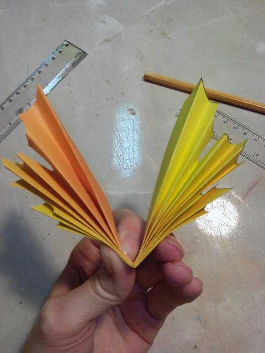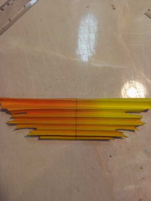 Шаг шестой. Сгибаем гармошку пополам, как раз по линии пунктира. Две длинные части склеиваем с помощью клея-карандаша. Даем высохнуть, немного расправляем гармошки, чтобы лучше показать все переходы цвета.