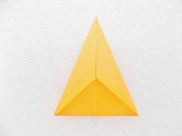 Складываем квадрат по диагонали и его боковые стороны загибаем к средней линии.