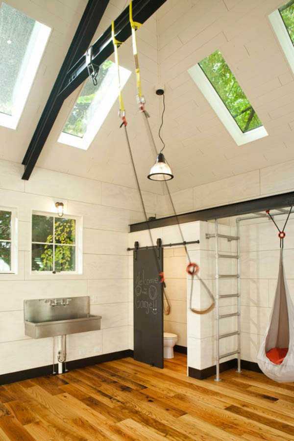 Проект разработан архитектором Margaret Menter для двухэтажного гаража. Многоцелевой павильон из него был сформирован, для того чтобы вовлечь семью в творческое и физическое взаимодействие. Здесь разрешено делать всё – комната легко трансформируется и меняет своё назначение. Пространство используется для чтения в гамаках, занятий на брусьях и лазания по альпинистским верёвкам. Не возбраняется просто свободно бегать. Часто устраиваются семейные просмотры фильмов. В павильоне есть ванная и туалет.