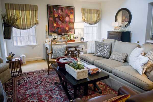 Акцент сделан на грубо обработанную мебель из дерева, диваны украшены красивым орнаментом в тон ковровому покрытию, а на полках можно увидеть редкие антикварные элементы декора.