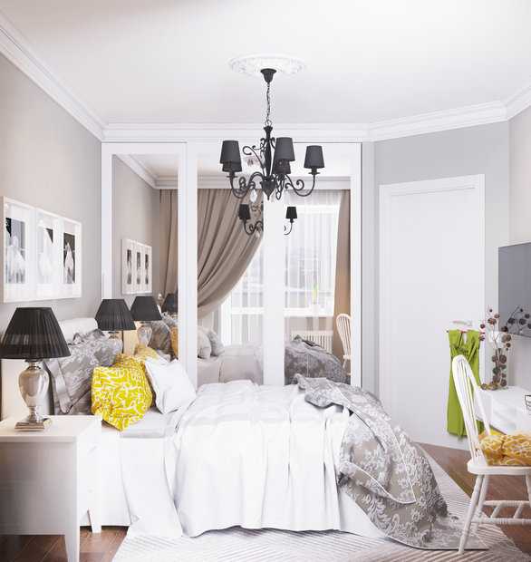 На месте кухни организовали спальню с большой кроватью, туалетным столиком, шкафом и прикроватными тумбочками. Помещение не очень большое, поэтому цветовая гамма выбрана также светлая с контрастной черной люстрой и желтым текстилем.