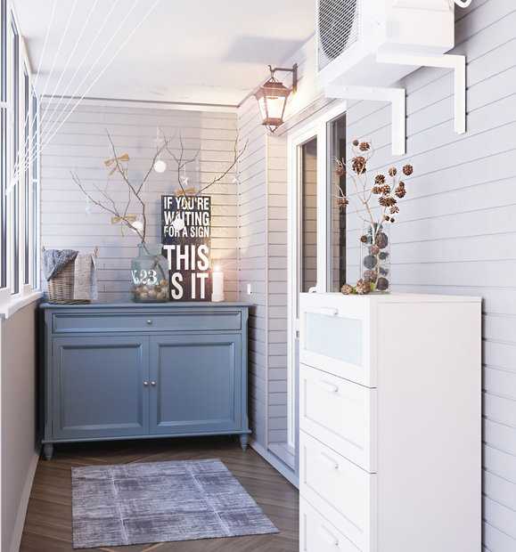 Просторный балкон получился многофункциональным. На нем разместилось рабочее место, шкаф и комод для хранения и место отдыха в виде двух кресел и сервировочного столика. Стены обшиты евровагонкой и выкрашены в светло-серый цвет. Как и в спальне, серый фон хорошо гармонирует с черным, белым и коралловым цветами.