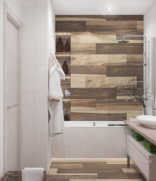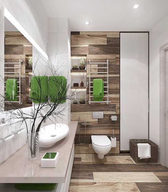 В санузле использовалась белая плитка и керамогранит под деревянные доски. Освежает это сочетание яркая зелень.
