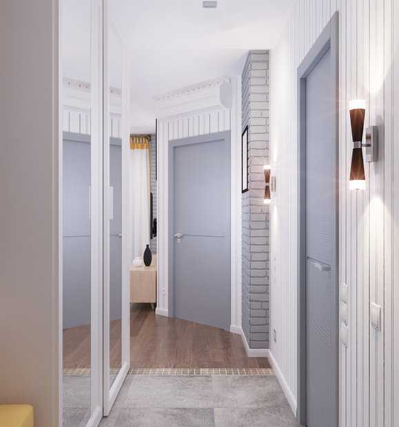 Чтобы мужчине было комфортно в маленькой квартире, нужно расширить территорию санкомнаты и выкроить место под вместительную гардеробную. Этот вопрос может быть решен переносом входа в спальню. Попадать в нее можно будет из кухни-гостиной. Теперь, после перепланировки однушки в двушку, в коридоре появилось достаточно места для установки шкафов и организации гардеробной для одного человека.