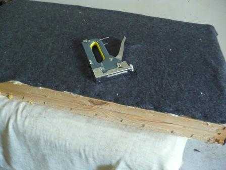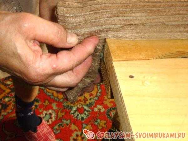 - Продолжаем действовать по ранее разработанному плану: ткань, поролон, синтепон, степлер, скобы, молоток.