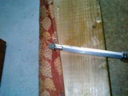 Загнув палас, фиксируем гвоздиками, чтоб при дальнейшей работе палас не смещался.