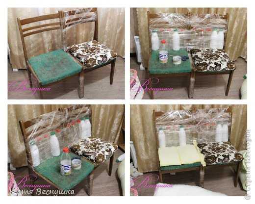 подмотала бутылки пластиковые, по 5 на каждый стул, чтобы дырки не было (из под молока простоквашино) благо бутылок много, хотела из них пуфик делать