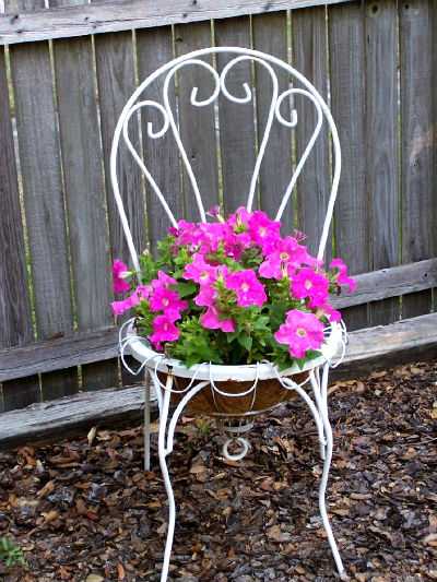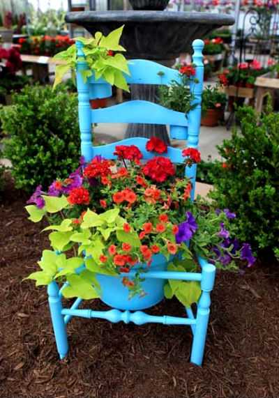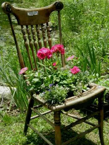 Накопилось в доме много хлама, не стоит огорчаться. Из старых стульев на даче удастся сделать оригинальные клумбы. Для этого придется немного постараться. Для начала следует обдумать дизайн. Можно стулья расставить по участку, и поместить на них горшки с цветами.