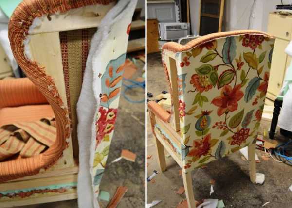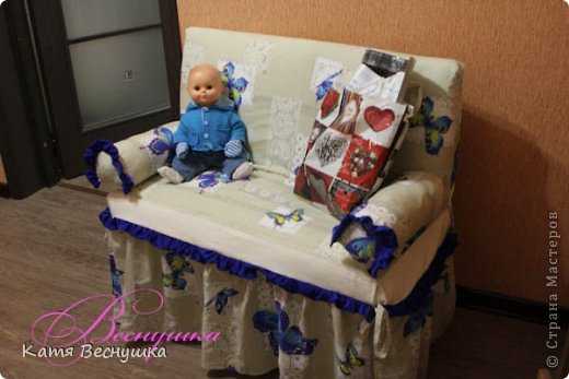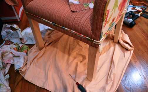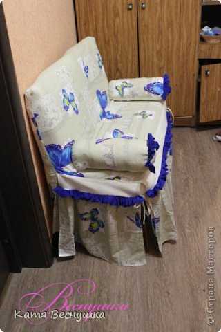 Оборачиваем тканью почти готовое кресло с подлокотниками.