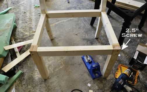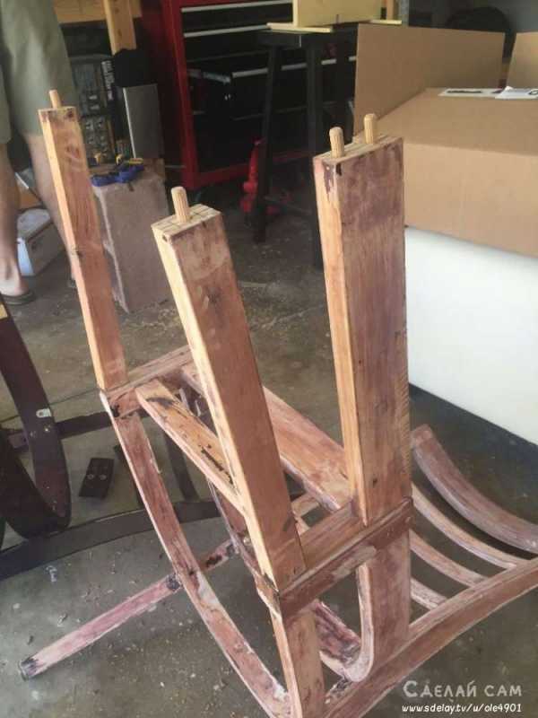 Далее, у оставшихся двух стульев спиливаем передние ножки. Таким образом, что бы можно было соединить их.