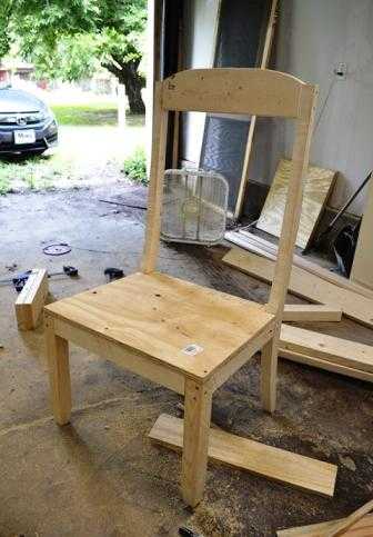 Долго не думая, для изготовления задней части конструкции кресла мы взяли обычные обеденный стул, который был в наличии, хотя он и был без сиденья. Но он хорошо подошел для роли шаблона. Можете взять какой-нибудь старый бабушкин стул.