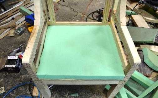 Вырежьте по размеру сидушки поролон толщиной 50 мм, приклейте его к поверхности фанеры.