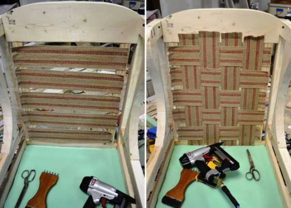 Закрепите горизонтальные текстильные лямки на спинку кресла с помощью строительного степлера, а потом вертикальные.