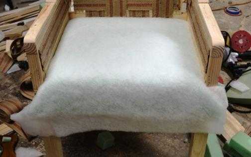 Затем мы покрыли синтепоном боковину и подлокотники. Для закрепления синтепона лучше применить аэрозольный клей, чтобы скрепление происходило по всей поверхности.