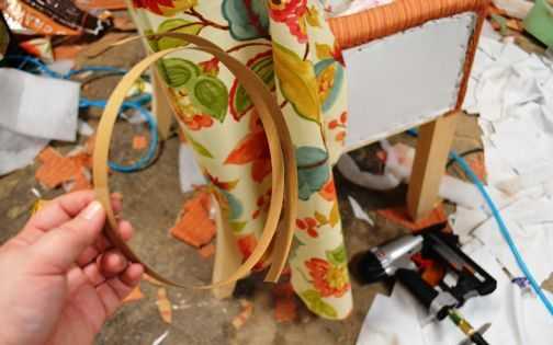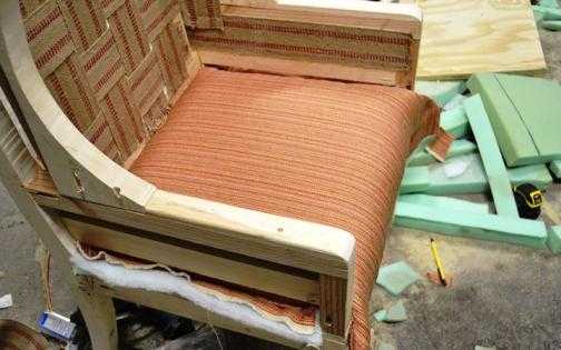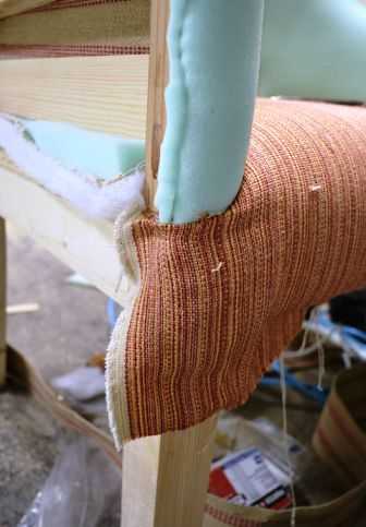 Прежде чем приступить к обивке немного укрепим каркас — добавим перекладины на спинку и подлокотники, как показано на фотографии.