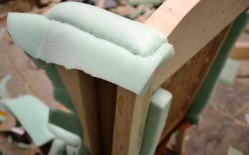 Закрепим поролон толщиной 25 мм на боковины и подлокотники кресла. Для обхода закруглений сделайте несколько надрезов как показано на фотографиях ниже.