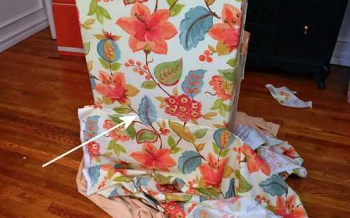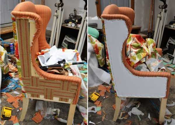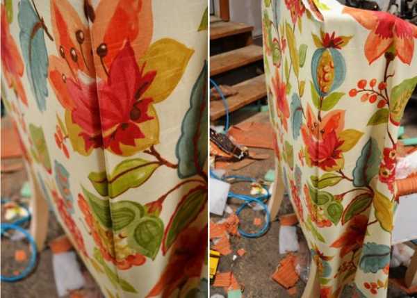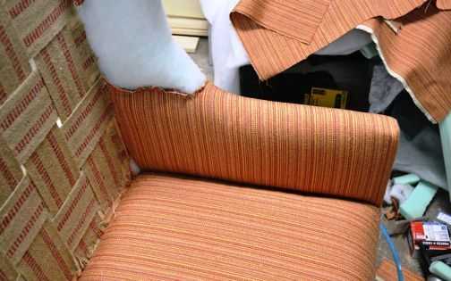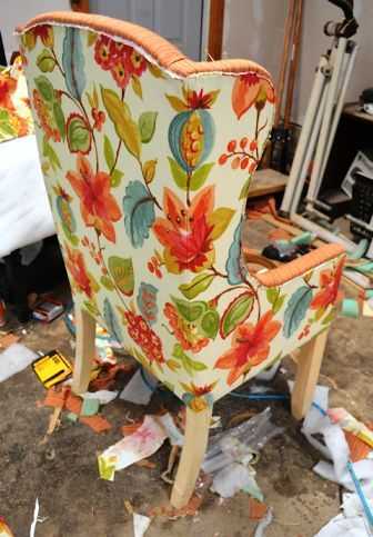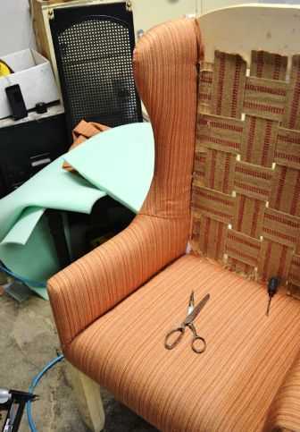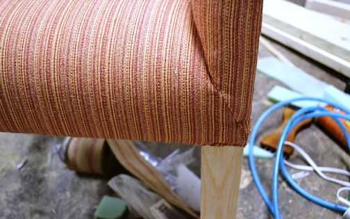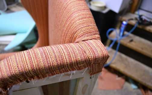 Продолжаем рассмотрение темы как сделать кресло каминное своими руками. Мебельную ткань сзади нужно закрепить, как показано на фото.