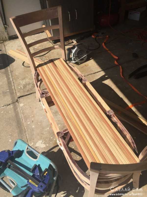 Зачищаем стулья и их остатки от лака, краски и т.д. После чего, крепим к ним, на деревянные скобы среднюю часть от двух разобранных стульев.
