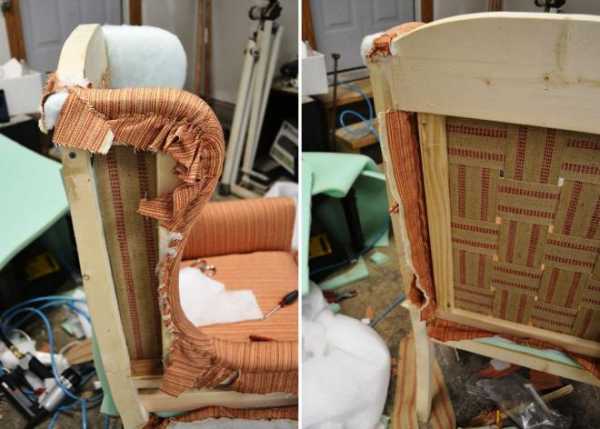 - Было у меня два кресла. Жутко неудобные, спинка высокая, сидеть неудобно, разве только боком, ножки маленькие, сиденье низкое, сами широкие и неповоротливые. Сначала поменяла им ножки на колесики. Стало веселее. Во всяком случае, при уборке уже стало возможно их сдвинуть с места. Потом я у одного кресла обрезала спинку. Пришлось его разобрать и поработать лобзиком. Лишнюю ткань просто заложила складкой и прошила незаметными стежками. Дело в том. что спинка кресла вверху имеет утолщение, причем в первоначальном варианте оно приходилось как раз на уровень затылка. Очень неудобно.