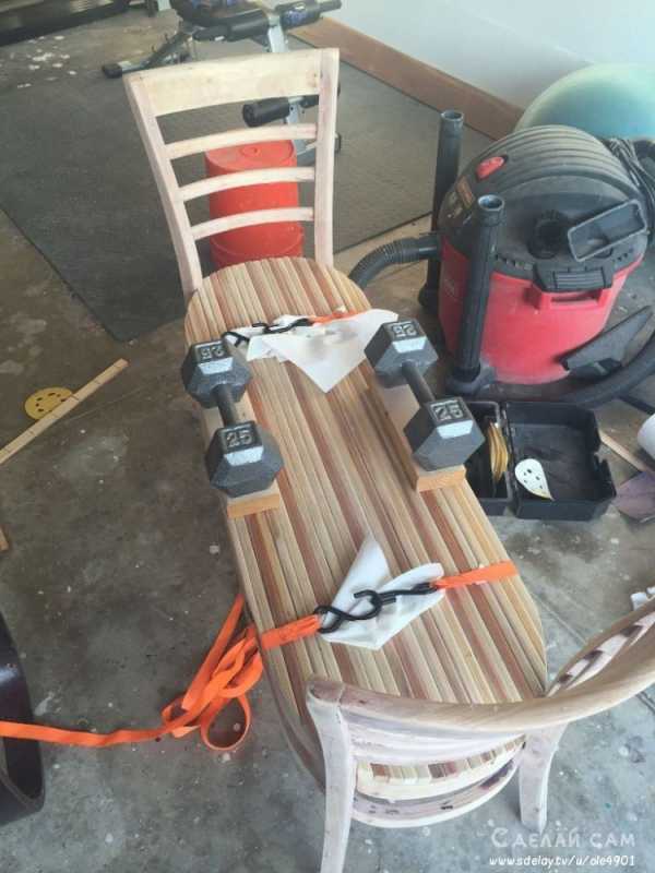 Покрываем все лаком. Далее, нарезаем деревянные рейки, для красоты можно прокрасить или покрыть морилкой часть из них. Что бы создать своего рода пианино. Приклеиваем рейки к основе стульев. Фиксируем их на время просыхания с помощью грузов.