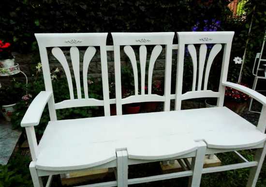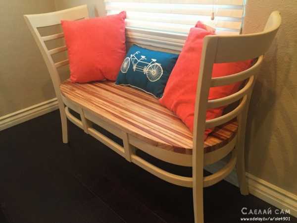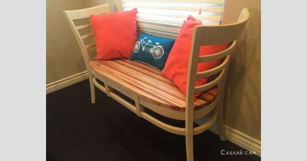 - Берем 2-3 стула, ставим их в ряд. Сверху кладем доску и сиденье. Получится лавка со спинкой.