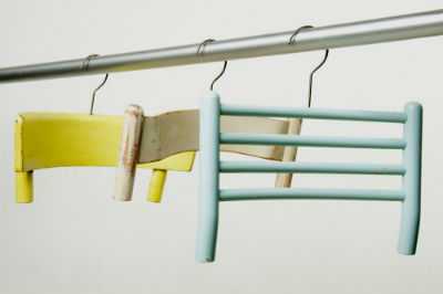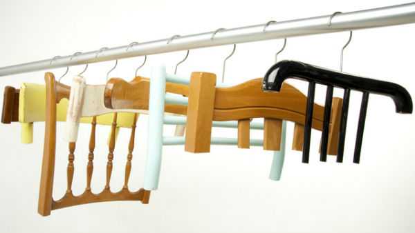 Вешалку-плечики в общем-то тоже не трудно изготовить, для этого необходимо запастись изогнутыми крючками, по размеру перекладины в шкафу и спинками ненужных стульев. Тонким сверлом в верхней части спинки стула необходимо создать отверстие, в которое вставить предварительно заготовленные крючки, покрытые у основания щедрым слоем клея.