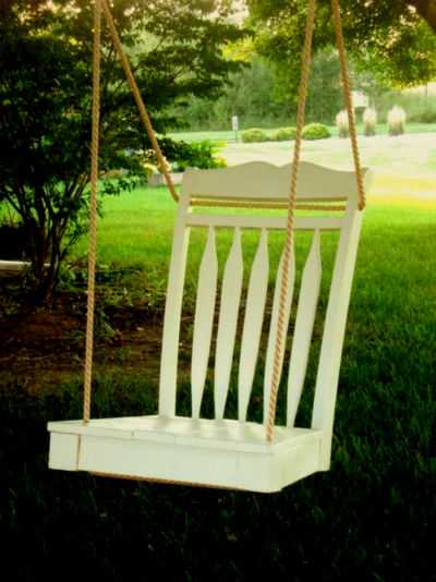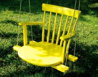 Великолепная идея для изготовления сидения качели. Необходимо взять сидение со спинкой от ненужного стула, снизу прибить две доски-перекладины, по краям которых просверлить отверстия, в которые продеть веревки. Готовую качельку закрепить на крепком дереве. Дети будут в восторге, особенно если сиденье покрасить в какой-нибудь яркий оттенок.