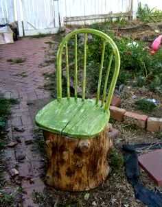 В саду есть старый, нелицеприятный пень, так почему бы не сделать из него внешне привлекательное кресло. Для этого берем сиденье стула и приклеиваем или прибиваем его к верхней части пня. Сиденье можно покрасить в яркий оттенок или декорировать в технике декупаж.