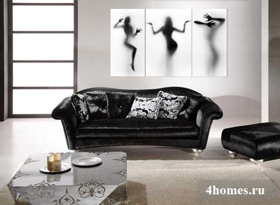 Для дополнения гостиной, оформленной в стиле модерн или хай-тек, подойдут необычные, абстрактные или четкие геометрические изображения.