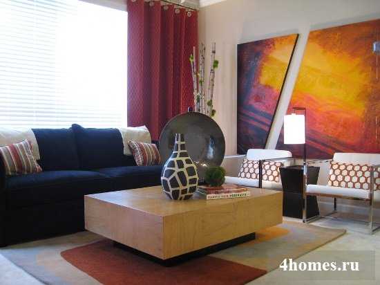 Гостиная считается отличным местом для экспериментов и сочетания различных светлых и солнечных цветов. Если конкретных правил, касающихся сочетания оттенков, нет, то размеры картины должны соответствовать размерам помещения.