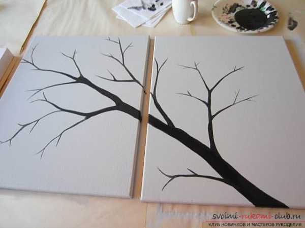 Затем темной краской нарисуйте ветки дерева. Ветки могут быть, какие угодно ведь в природе нет одинаковых деревьев.