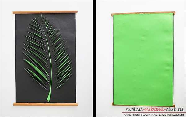 Еще одно интересное панно на стену можно сделать с помощью плотной цветной бумаги. Для этого нужно взять несколько листов черной и зеленой двусторонней цветной бумаги, которую можно купить в канцелярском магазине.
