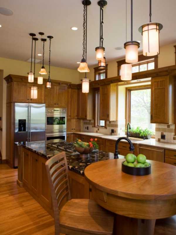 Не должна быть обойдена вниманием и обеденная зона. Здесь прекрасным решением станет низко висящий над столом красивый светильник с оригинальным плафоном или абажуром. Если такая конструкция для стиля оформления вашей уютной кухни кажется слишком громоздкой, то используйте несколько изящных подвесов с небольшими плафонами. В случае, когда стол примыкает к стене, можно использовать бра, изливающие свет непосредственно на его поверхность.