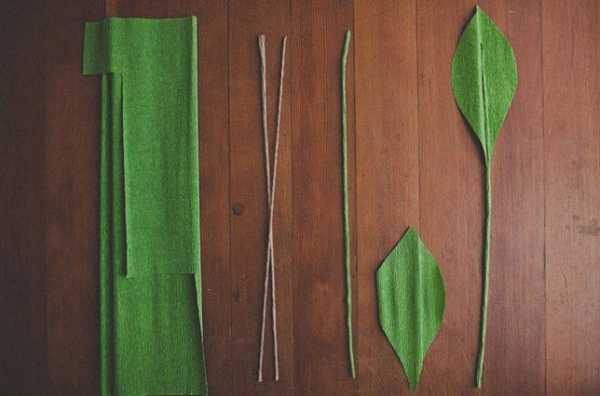 Изготовьте нужное вам количество листочков для розы из зеленой гофрированной бумаги. Проволоку тоже надо замотать бумагой зеленого цвета, и у цветочка будет стебелек.