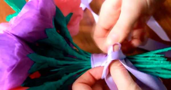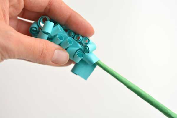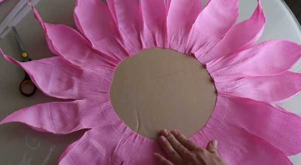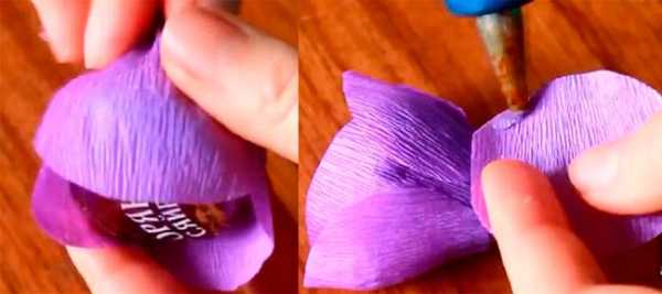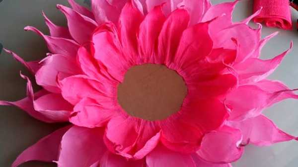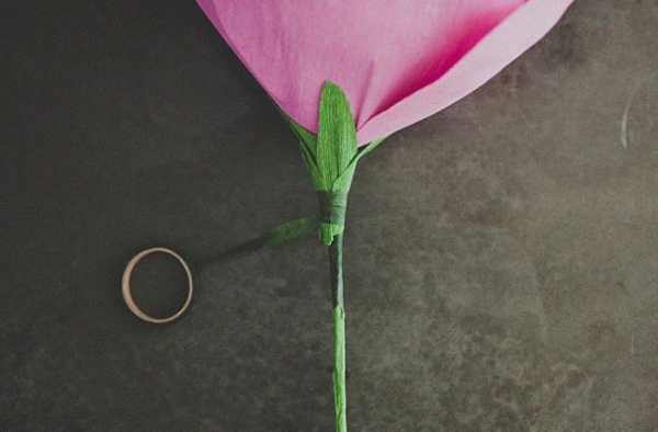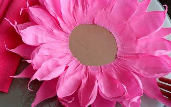 - Лепестки из гофрированной бумаги закрепить на стебле или на основе, чтобы между ними не было промежутков.