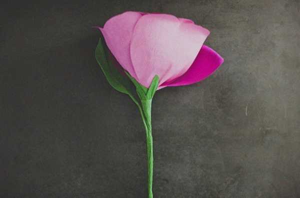 Далее по шаблону вырезаем лепесточек цветка. Таким же методом нужно вырезать листки с сердцевиной. Теперь надо немножко растянуть середину всех лепесточков. Лепесточки приклеиваются с сердцевины с использованием двухстороннего скотча. Приклеенные лепестки выворачиваем на обратную сторону. Посадите готовый цветок при помощи клея на стержень. Из гофрированной зеленой бумаги нужно отрезать полоску шириной в сантиметр и заверните ею цветочный стержень. У основания изделия приклейте зеленый бумажный листочек, а в конце стебелька – кончик зеленой полоски. Теперь вы знаете, как из бумаги делать цветок большого размера.