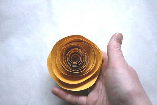 - после окончательного закручивания спирали – закрепляете ее клеем. Теперь нужно отогнуть круг, который образовался в центре вашей розы при вырезании спирали. Этот круг будет основанием цветочка;