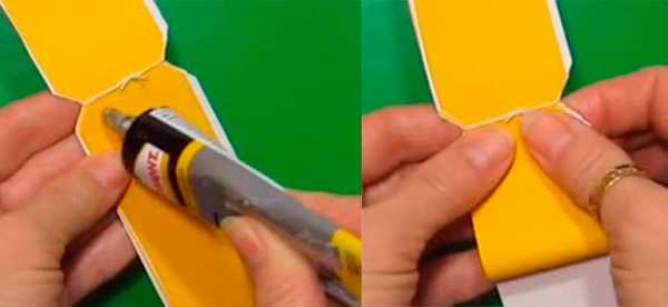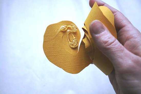 - наносите клей на два лепесточка и теперь их нужно приделать к стеблю на место, обмотанное желтой бумажной полоской. Складываете, таким образом, все лепесточки в бутон;