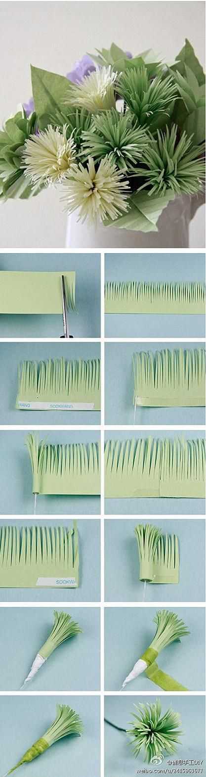 Мастер класс, как сделать цветы из бумаги своими руками с помощью шаблонов, отлично подойдет для изготовления украшения на стену (цветы можно нанизать на леску или нитку и изготовить гирлянду), искусственных букетов ромашек, камелий и других цветов с множеством прямых лепестков. Цветочная гирлянда станет отличным решением праздничного украшения зала.